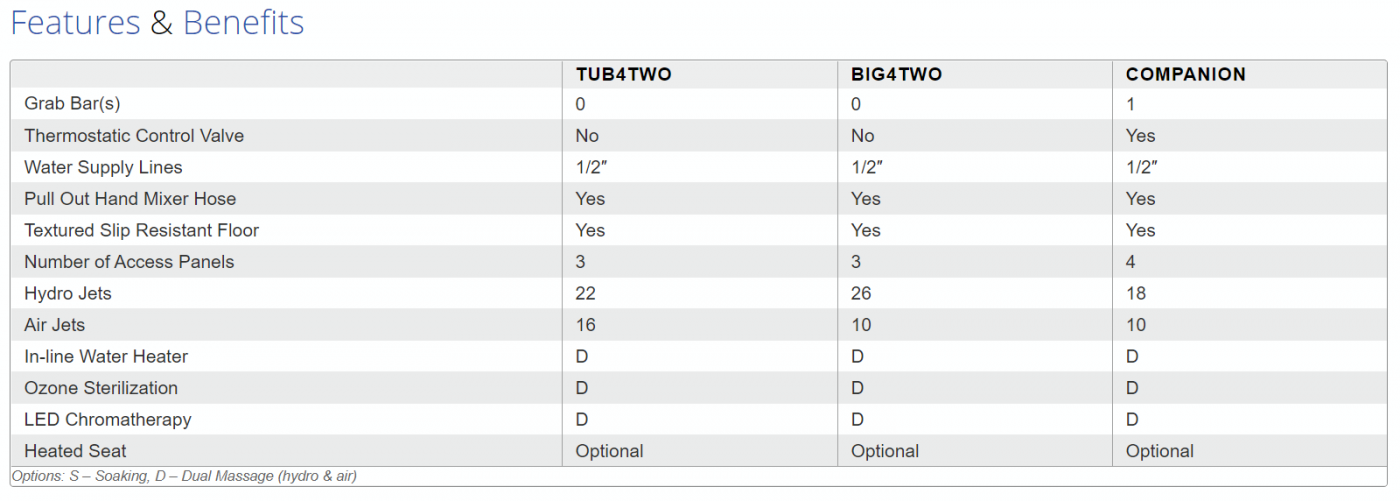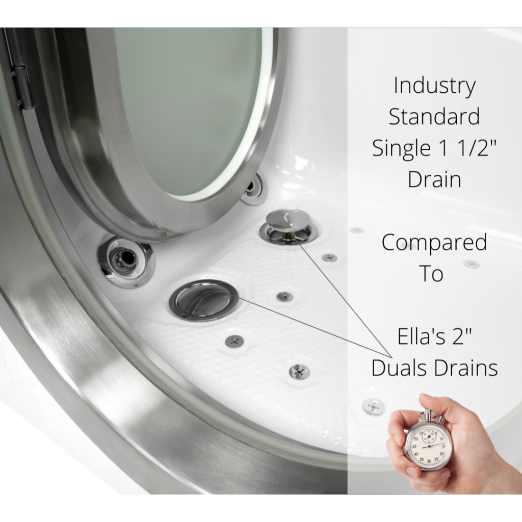 • Proprietary dual drain technology. Dual T-Type 4 port drains provide the fastest gravity driven drain system in the industry. Under ideal plumbing conditions, your tub can drain in 80-120 seconds. Natural, gravity driven drains are the most reliable, as they require no electricity to operate, whereas electrical driven drains may fail due to electrical shorts or power outages.