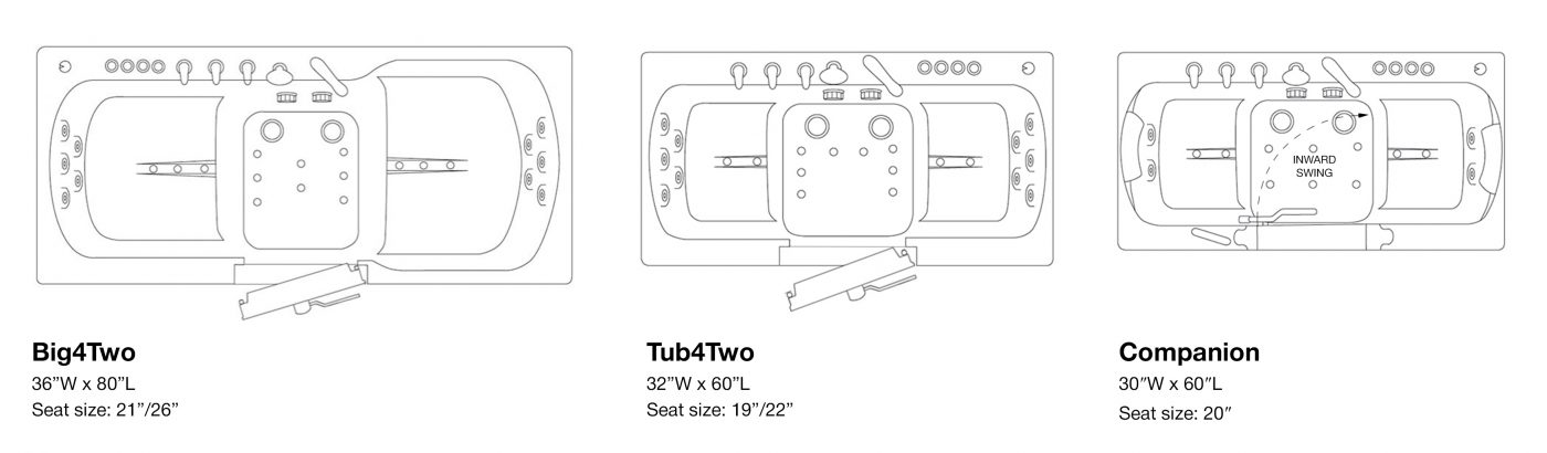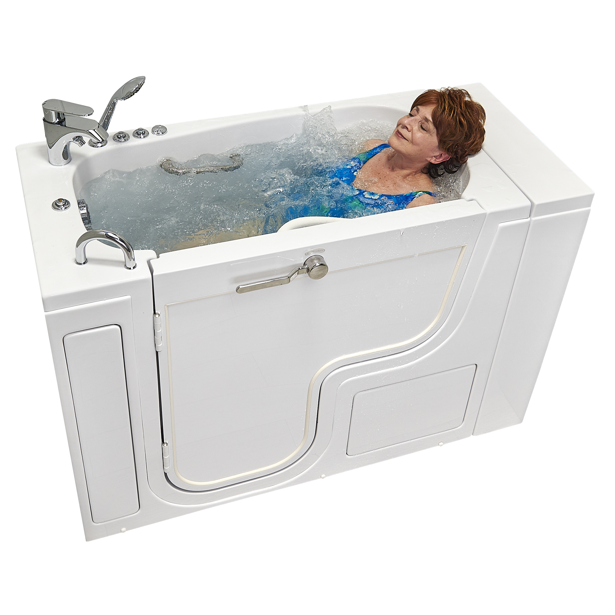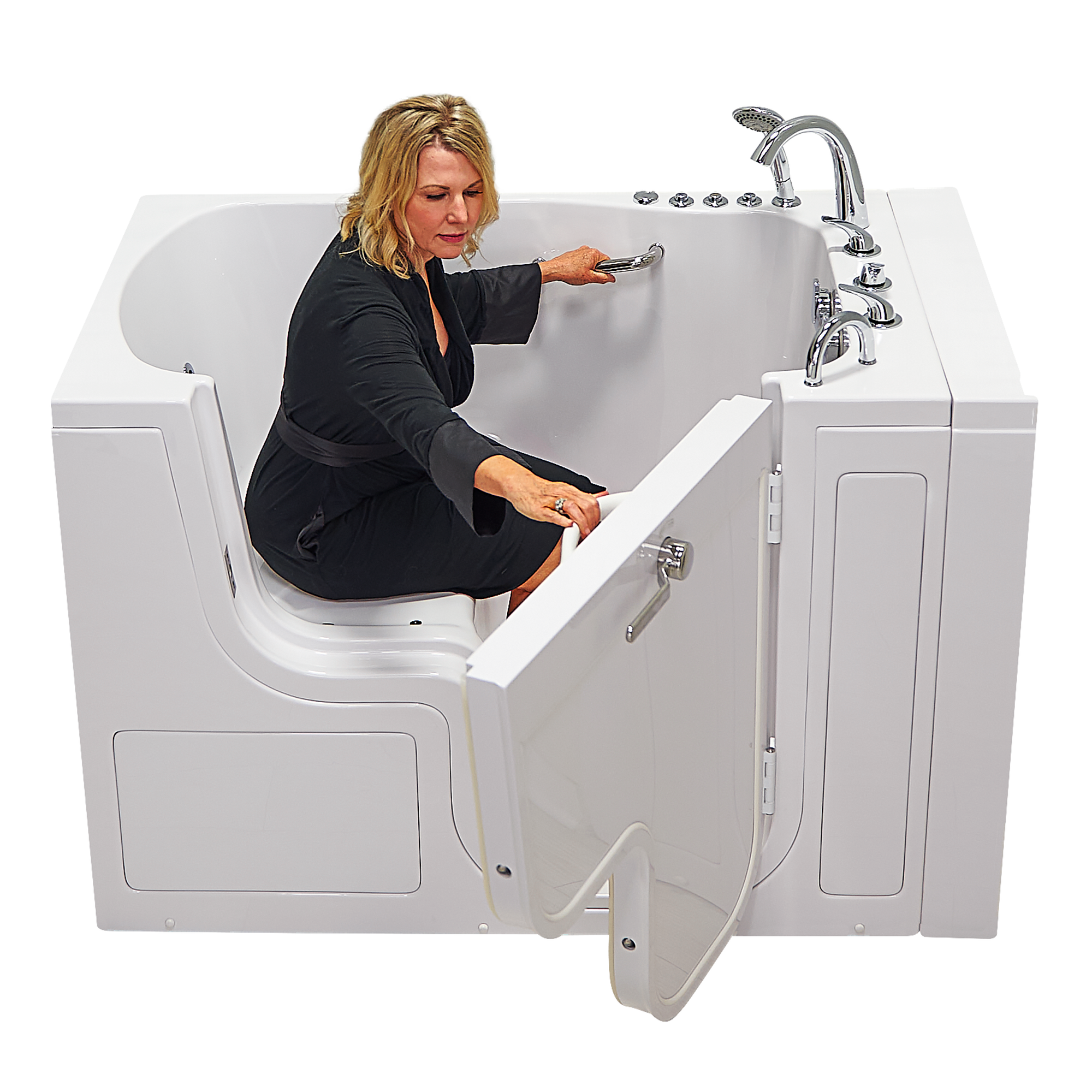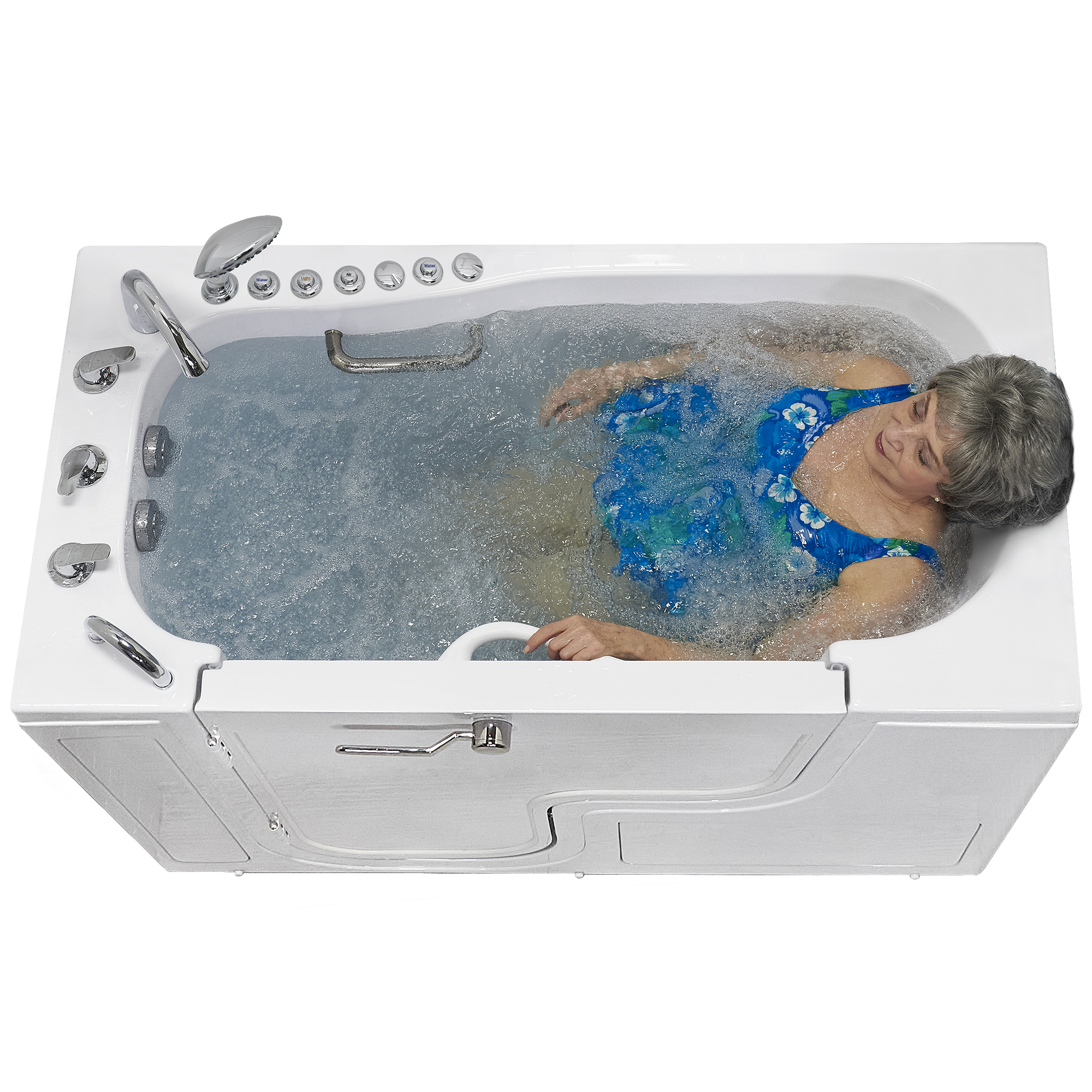 Ella Transfer walk-in tubs feature the outswing aluminum L-Shape Door. This extra wide, L shaped barrier-free sidewall design, allows bathers to easily sit or transfer from a wheelchair into a comfortable, wide molded seat. These models are also very popular for non-wheelchair users who are looking for effortless slide-in access to the seat. The large L-shape outward swing doors are made out of a light, but strong aluminum frame with a white acrylic cover that elegantly matches the glossy acrylic finish of the tub.