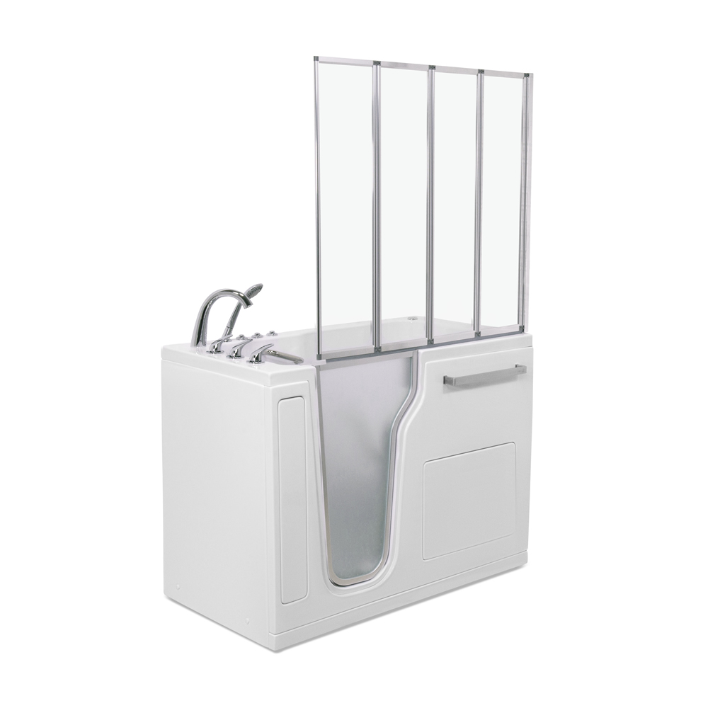 Ella wheelchair accessible walk in tubs are made with a high-quality gloss finish acrylic shell along with a frame-less L-Shaped aluminum door for soft and warm to touch slide in over the acrylic seat and easy access to those needing extra space to get in and out of the walk-in tub.